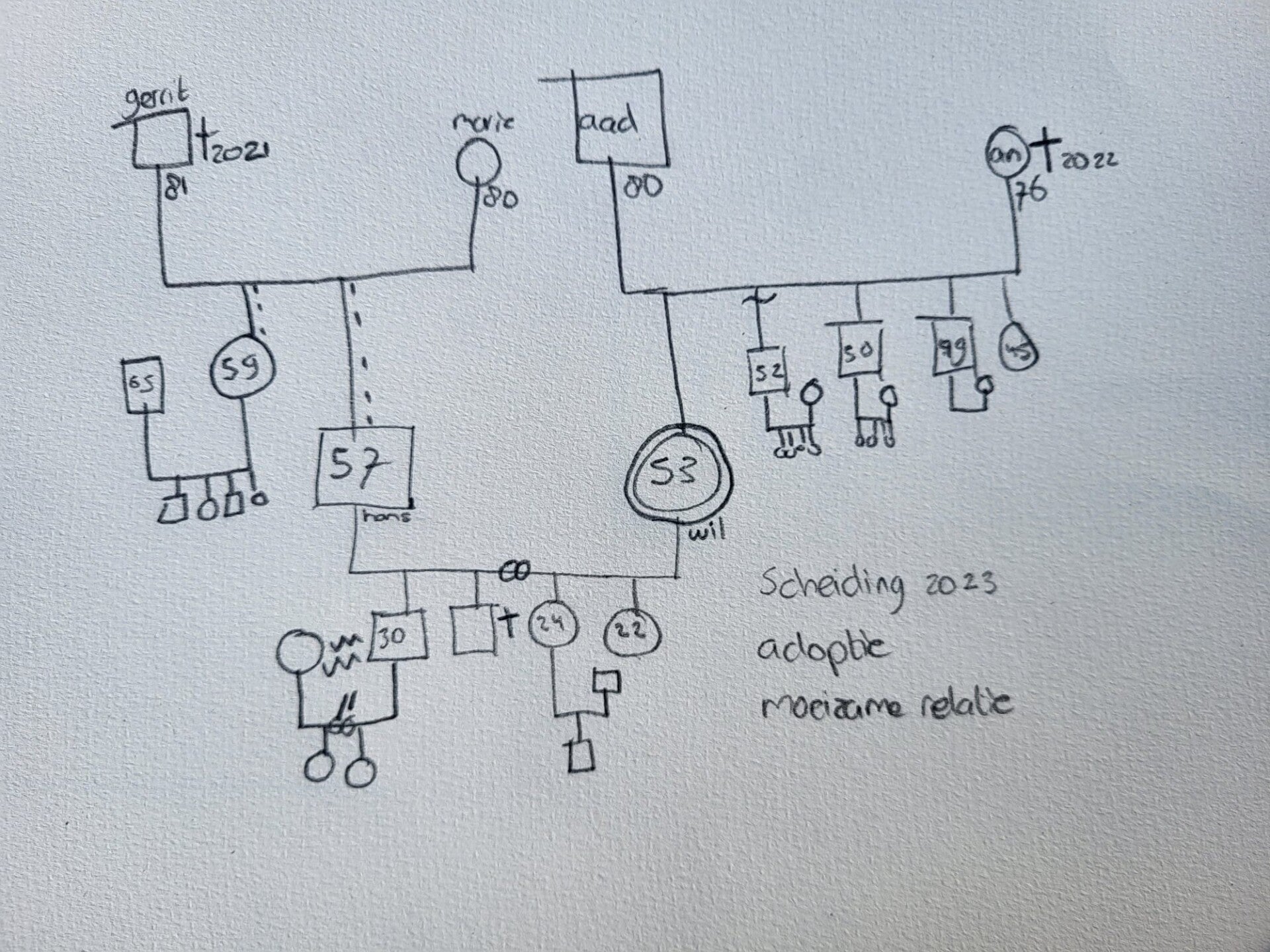 De therapie kan zowel individueel plaatsvinden als samen met mensen die belangrijk voor je zijn. Ik werk vaak met een genogram, een visueel hulpmiddel om familierelaties en patronen in kaart te brengen. Daarnaast kan het gebruik van andere materialen, zoals poppetjes, helpen om visueel te maken welke plek jij inneemt binnen je familie en andere relaties. Niet alleen woorden, maar ook beelden kunnen vaak waardevol inzicht bieden.